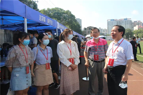 9月19日上午,学校校长刘起军在学院党委副书记陈胜国陪同下,莅临我院新生报到点视察指导迎新工作。刘起军亲切问候了现场工作人员和学生志愿者,详细询问了迎新点准备情况、新生报到流程及报到进度,并了解了我院特色迎新活动——“致未来的自己”时光邮箱投递活动。随后,我院院长肖北庚、院党委书记唐建文、院党委副书记陈胜国前往新生宿舍区慰问新生,为他们送去学院关怀。