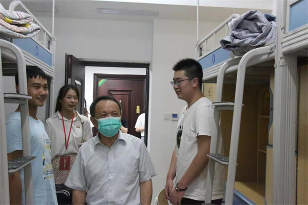 院长肖北庚一行人慰问了迎新工作人员,肯定了他们的工作态度和效率。随后,他们前往宿舍区慰问新生,与新生亲切交谈入学感受,关心新生的生活适应问题,听取学生对住宿环境的反馈意见。肖北庚一行人鼓励新生克服困难、快速适应,以积极向上、饱满热情的态度迎接即将到来的军训生活和美好的大学新生活。