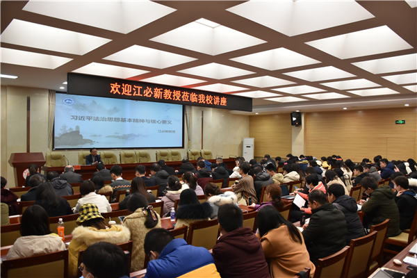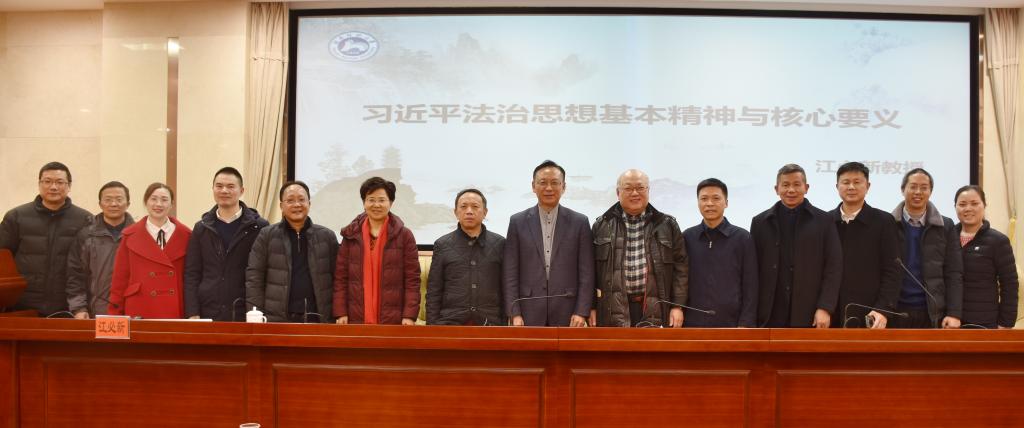 (通讯员 邓良 余青泉 付晓洁)12月20日晚上,第十三届全国人民代表大会宪法和法律委员会副主任委员、中国法学会副会长、原最高人民法院党组副书记、副院长、审判委员会委员江必新教授做客我院,为我院师生带来了题为“习近平法治思想基本精神与核心要义”的学术讲座。此次讲座在我院205会议室举行,由我院院长肖北庚教授担任主持人。