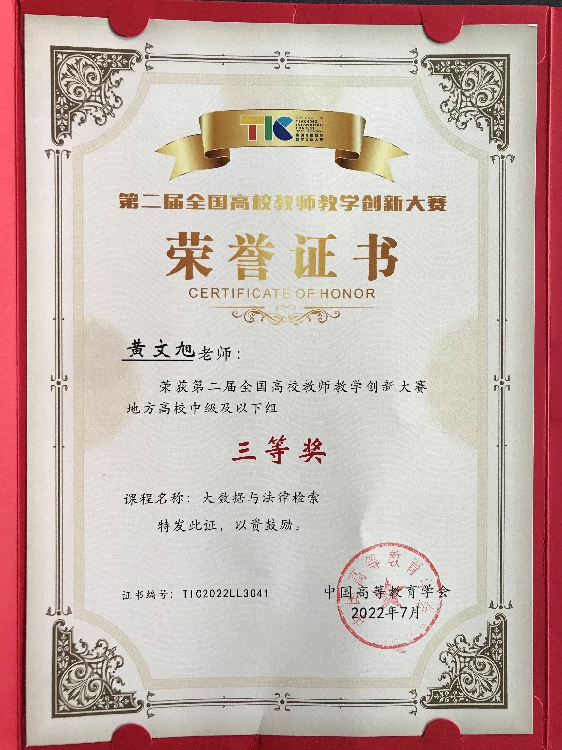 (通讯员 黄洁 周凌月)2022年7月31日,第二届全国高校教师教学创新大赛顺利闭幕。我院教师黄文旭主讲的《大数据与法律检索》课程(团队成员:黄文旭、蒋新苗、王葆莳、乔一涓)斩获全国三等奖。