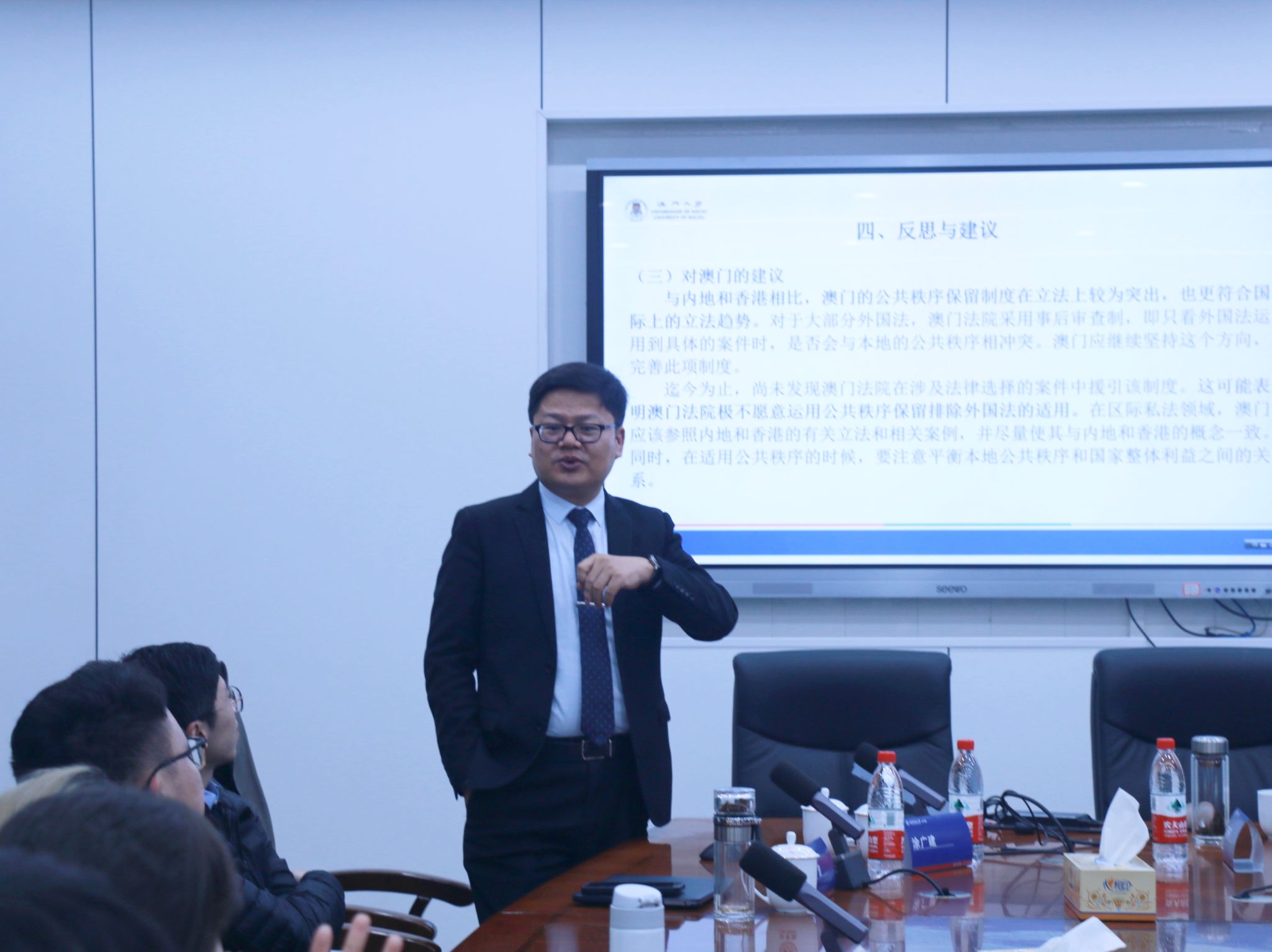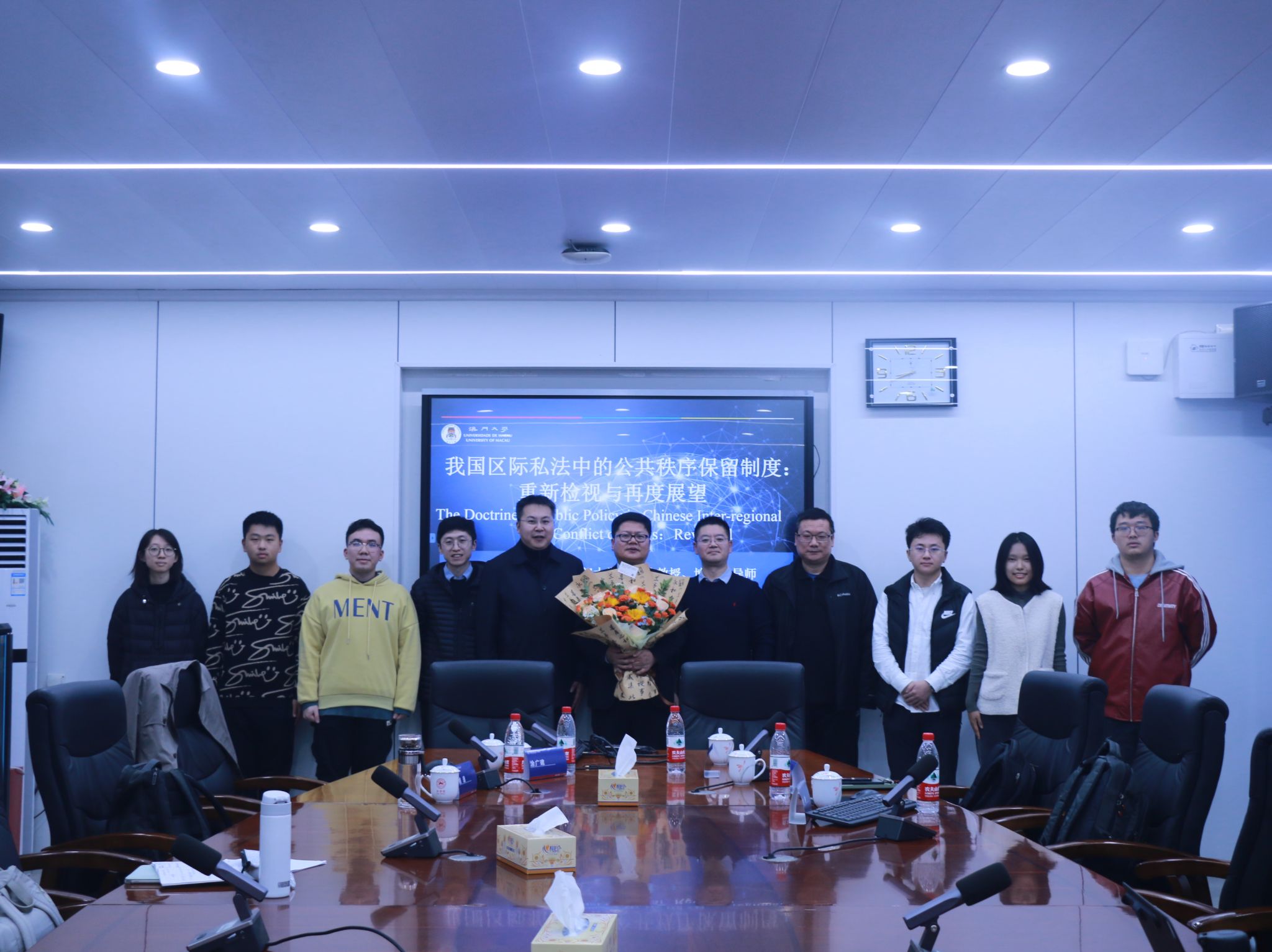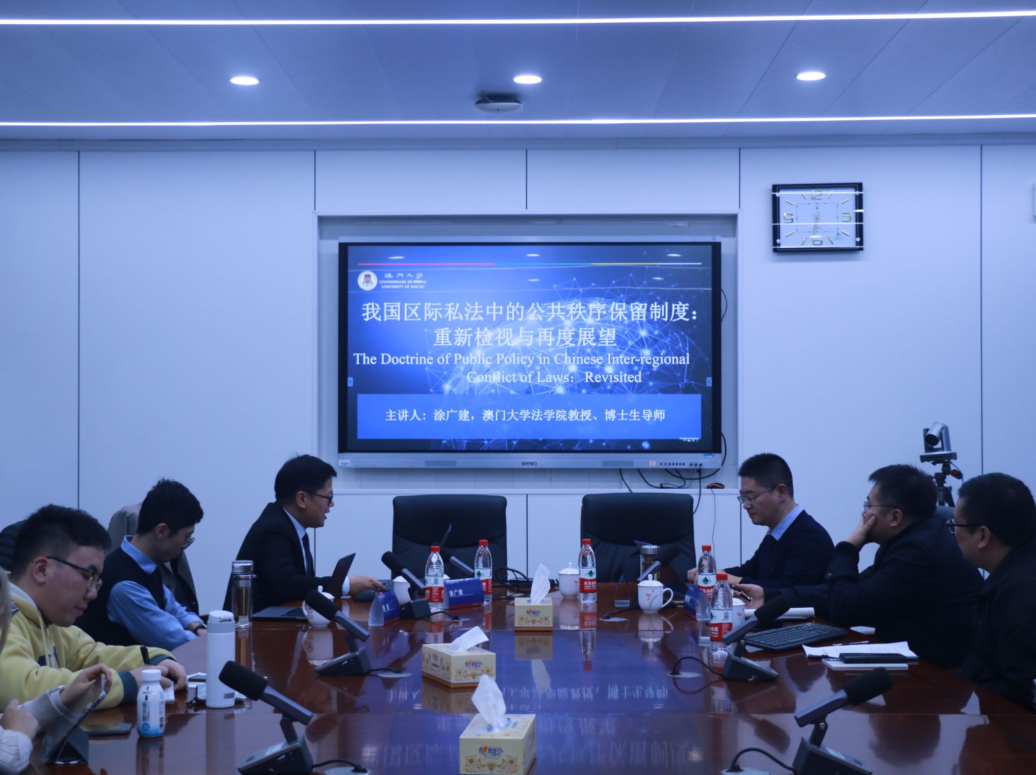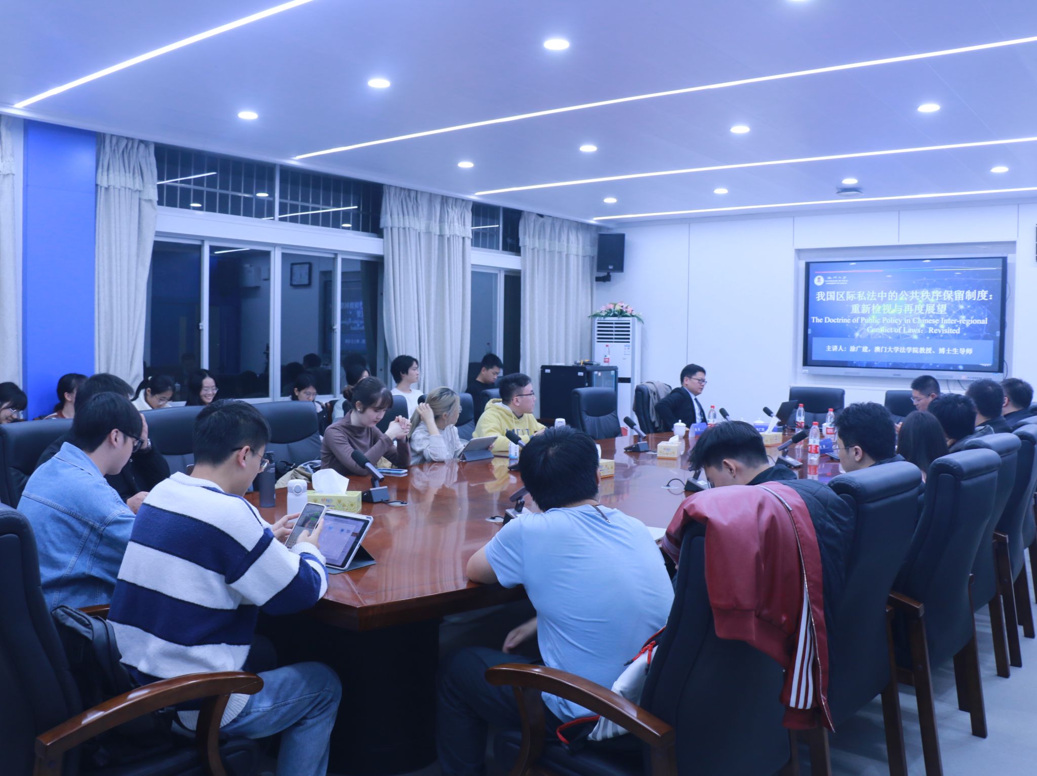(通讯员 江杨续东 李雯燕 胡康文)11月24日晚,澳门大学VICTOR1946高级法律研究所所长、博士生导师涂广建教授在景德楼北栋304会议室开展“我国区际私法中的公共秩序保留制度:重新检视与再度展望”专题讲座。我院党委副书记曹俊峰,硕士研究生导师刘琳,国际法所讲师姚迪出席此次讲座。讲座由我院硕士研究生导师王葆莳教授主持。