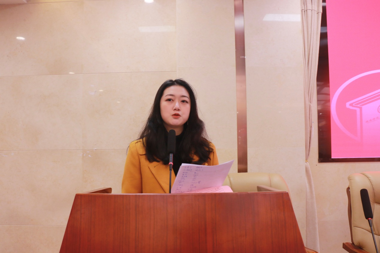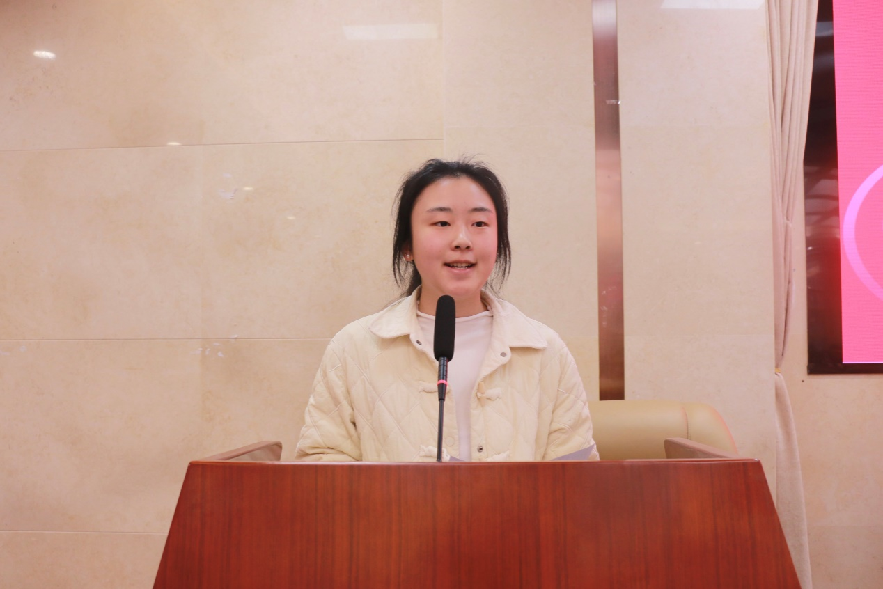 研究生代表肖扉予发言。肖扉予结合自身跨专业考研和入党的学习经历,讲述了逐渐认识宪法、了解宪法的过程。她表示法学生应始终坚持宪法精神,秉持法治理念,维护社会公平正义;要始终坚持以宪法为准则,以法律为武器,为人民的合法权益保驾护航。