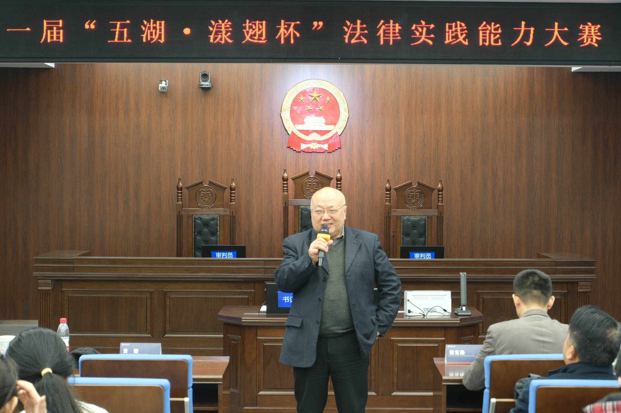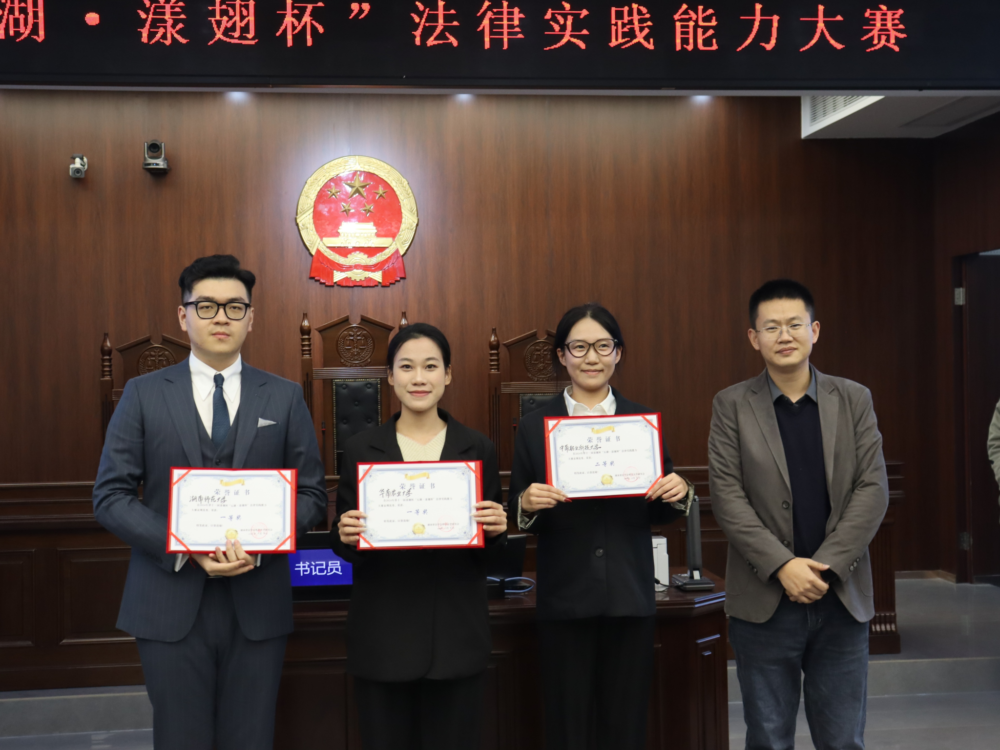 (通讯员 范峥 柒银娟)12月8日晚,第十一届漾翅杯“五湖·漾翅杯”法律实践能力大赛闭幕式在景德楼南栋模拟法庭举行。湖南省高级人民法院审判监督第一庭副庭长向英,长沙市雨花区人民法院民一庭副庭长李莉,省检察院公益诉讼检察部一级检察官助理张广涛,湖南五湖律师事务所主任郑宇敦,湖南五湖律师事务所高级合伙人严冠军,湖南五湖律师事务所律师段言路,我院教授、湖南省法学会程序法学研究会会长黄捷、副会长郑太福,出席本次开幕式。本次开幕式由我校漾翅法律实践团队队员主持。