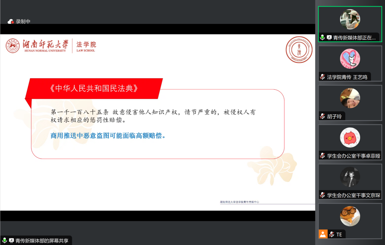 4月26日晚,针对学生宣传工作的版权保护专题讲座由我院青年传媒中心组织。2023级、2024级本科生宣传委员及院团委、学生会代表线上参与讲座。三位主讲人结合《著作权法》条款与真实案例,分别从推送图片使用、文章撰写引用、海报设计等维度,解析版权侵权风险并提出合规建议。新媒体部部长杨希瑶以“校园新媒体图片侵权纠纷”为例,梳理图片使用中的法律风险;评论部部长曹彤通过实务案例强调著作引用与改编的授权界限;网络文化办公室部长范雨萱则针对海报设计中的字体、图片版权问题,提出“高危侵权点”警示与实操建议。院青年传媒中心主任王艺鸣在总结中强调,讲座旨在提升学生版权保护意识,推动宣传工作规范发展。活动尾声的答题环节进一步巩固了学习成果。