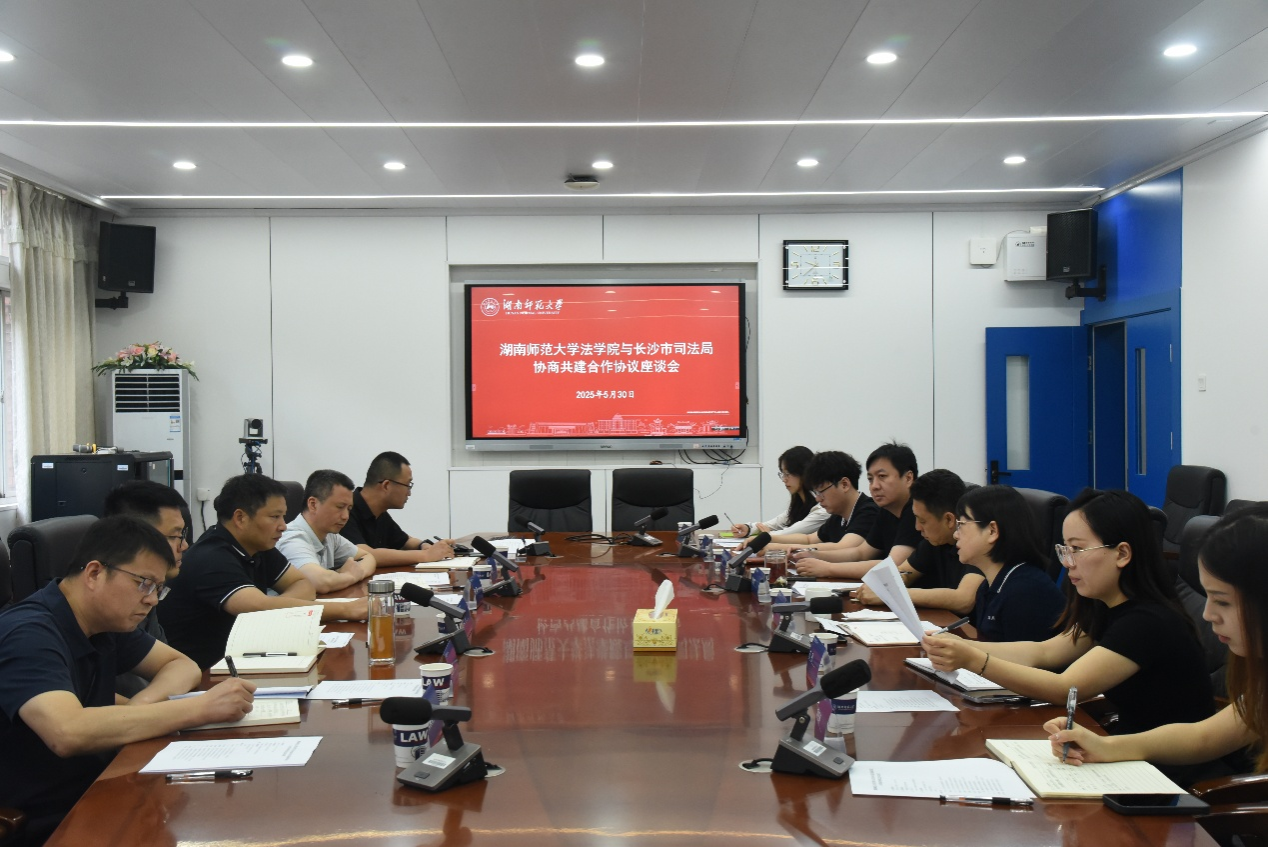 (通讯员 文彬琪)5月30日上午,我院与长沙市司法局协商共建合作协议座谈会于304会议室顺利开展。长沙市司法局党组成员、政治部主任陈勇、政治部副主任杨海洪、普法与依法处理处处长王文、公共法律服务处处长黄坤浩、教育培训处处长文景祥以及律师管理处一级主任科员王焕清,我院副院长耿自强、副院长何燕华、副教授于熠、研究生办公室主任王丹、法硕办负责人罗昊、学工办负责人胡钰琬以及学工办辅导员张宁莎出席了本次座谈会。会议由何燕华主持。