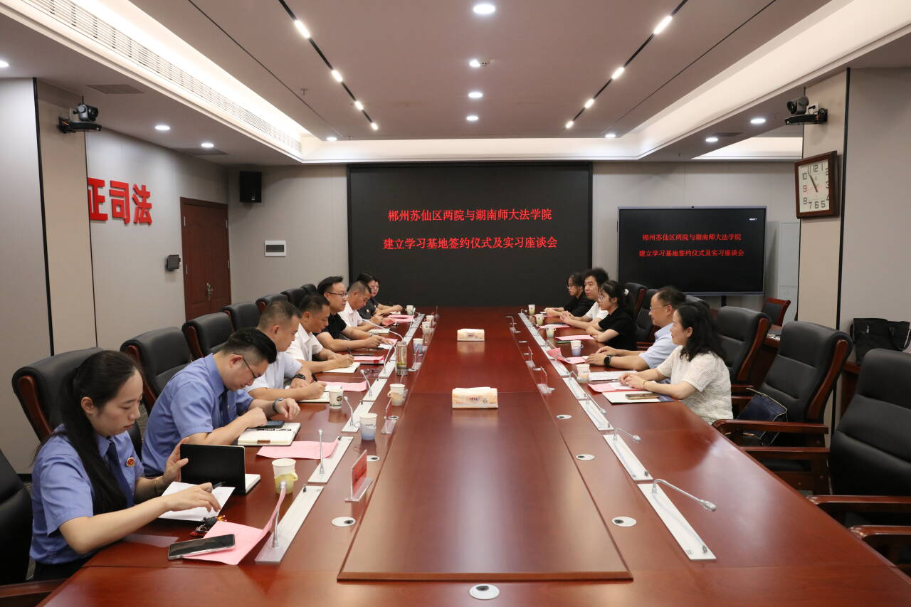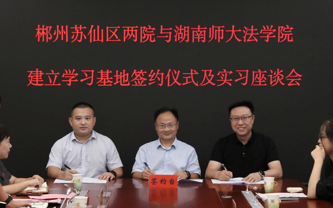 (通讯员 卜湘蓉 韩蕴恬)8月15日,在郴州市苏仙区政法委的大力支持下,我院和郴州市苏仙区人民法院、郴州市苏仙区人民检察院建立实习基地的签约仪式及实习座谈会在郴州市苏仙区人民法院举行。郴州市苏仙区委常委、政法委吕银俊,我院副院长周刚志,郴州市苏仙区人民法院党组书记及院长谢末钢,郴州市苏仙区人民检察院党组书记及检察长喻超,我院教务办主任阎英,苏仙区人民法院党组成员及政治部主任李艳,苏仙区人民检察院党组成员及政治部主任刘力以及相关科室负责人参与此次签约仪式及座谈会。会议由苏仙区委政法委副书记何飞主持。