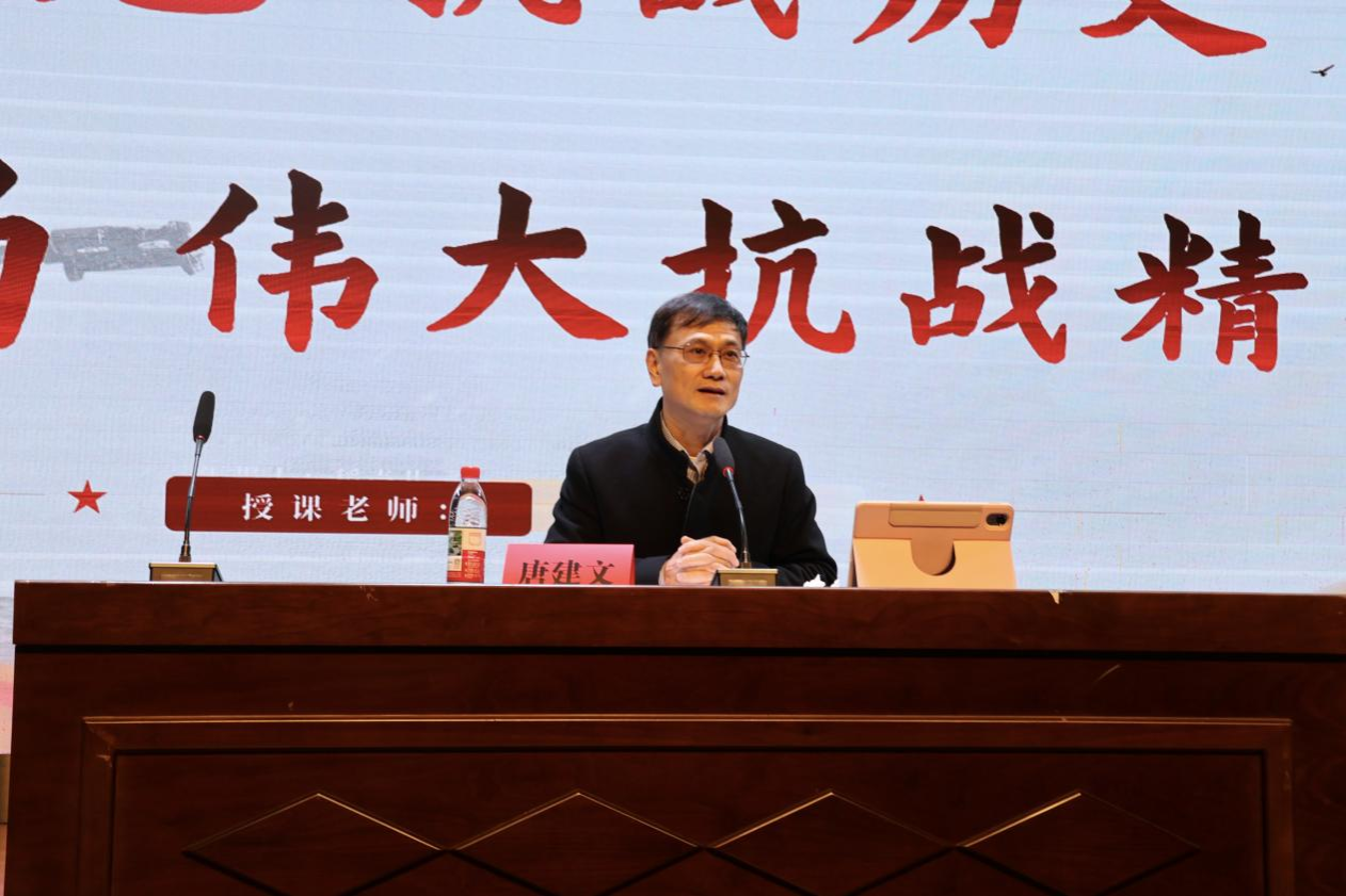 唐建文围绕“日军侵华暴行”“中国共产党在抗战中的中流砥柱作用”“抗战精神的内涵与意义”三个方面展开论述。他指出:一是抗战期间日本在我国犯下严重罪行,给中国人民带来深重灾难;二是中国共产党以坚定的抗战意志、科学主张和积极行动,团结各民族、各党派、各阶层顽强抗战,发挥中流砥柱作用;三是抗战精神内涵体现为爱国情怀、民族气节、英雄气概和必胜信念——它推动中华民族伟大复兴;并为世界反法西斯战争作出巨大贡献,获国际社会广泛认可。