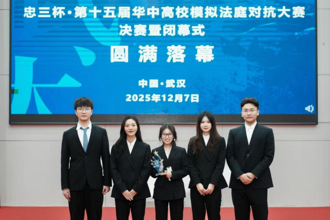 (通讯员 于是 解靖)12月7日,忠三杯·第十五届华中高校模拟法庭对抗大赛决赛暨闭幕式在武汉大学VICTOR1946举行。由2024级研究生于是、刘家豪、寻雅玲、陈怡、李文静组成的我院研究生代表队凭借出色的表现,荣获大赛季军。我院教授黄捷担任团队指导老师,我院副教授黄文旭代表我校担任本次比赛初赛书状评审。