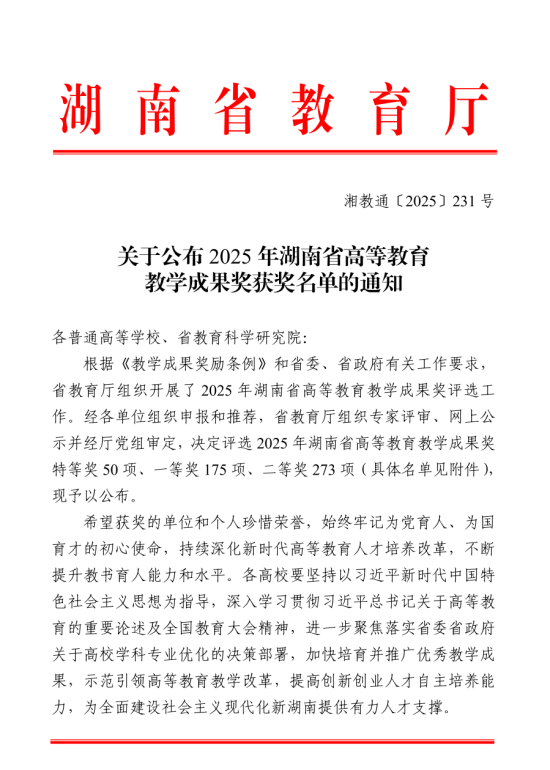 (通讯员 韩蕴恬)近日,湖南省教育厅公布2025年湖南省高等教育教学成果奖获奖名单,我院蒋新苗教授团队成果《“数智+协同”:新文科背景下法律实务技能课程体系与标准的研究与实施路径》获评省级特等奖,何燕华副教授团队成果《需求导向、数字赋能、协同创新:地方高校涉外法治人才实践能力提升探索》获评省级二等奖,充分彰显我院在法学教育教学改革与卓越法治人才培养领域的深厚积淀与突出成效。
