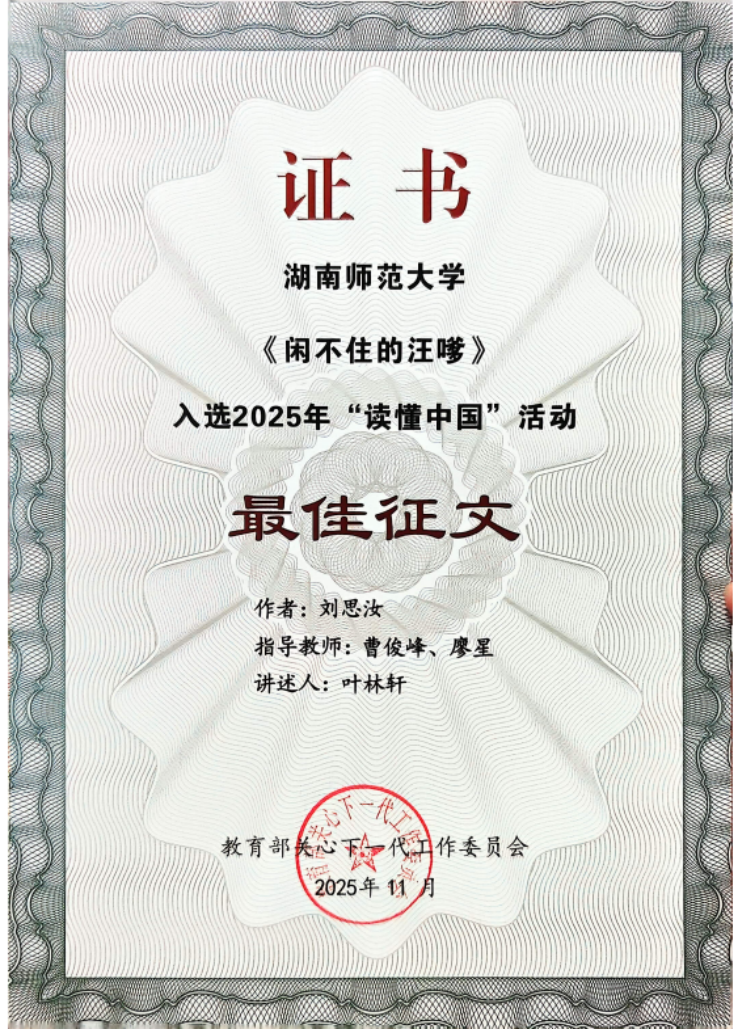会议宣布,我院2022级本科生刘思汝的《闲不住的汪嗲》征文获教育部关工委2025年“读懂中国”活动最佳征文奖、湖南省教育厅关工委2025年“读懂中国”主题教育活动征文特等奖,我院关工委获评校“读懂中国”主题教育活动优秀组织奖。我院关工委常务副主任蔡雪冰作为从事关工委工作十年以上的老同志接受表彰。