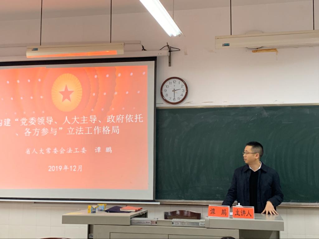 12月20日下午2时30分,湖南省人大常委会法工委办公室副主任谭鹏莅临我院,在413教室为环境与资源保护法学专业研究生带来“构建‘党委领导、人大主导、政府依托、各方参与’立法工作格局”专题讲座,我院陆强老师担任本次讲座主持人。