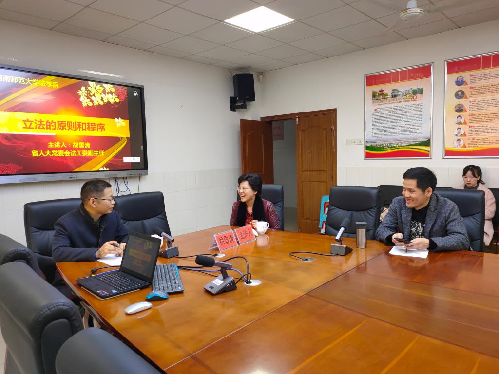 (通讯员 张羽楠)12月13日下午,湖南省人大常委会法工委副主任胡雪清莅临我院,在304会议室为环境法研究生带来题为“立法的原则和程序”的讲座,我院李爱年教授主持。