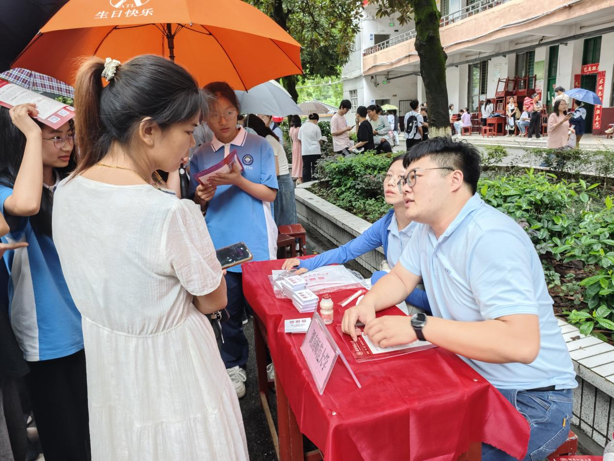 在郴州一中、郴州二中、永兴县一中、资兴市立中学以及安仁县一中招生咨询会现场,招生宣传组从学校概况、专业设置、师资力量、校园环境、学生活动、历年录取情况以及未来就业方向等内容等方面全方位展示了我校的人文环境、师资力量、人才培养和学科建设情况,并对报考我校的相关背景和条件进行了详细介绍。互动环节中,学生和家长们踊跃提问,老师们耐心解答,双方就高考志愿填报策略、未来职业规划等问题进行了深入探讨。五所中学参加宣讲会的学生和家长人数累计达千余人,现场气氛热烈。