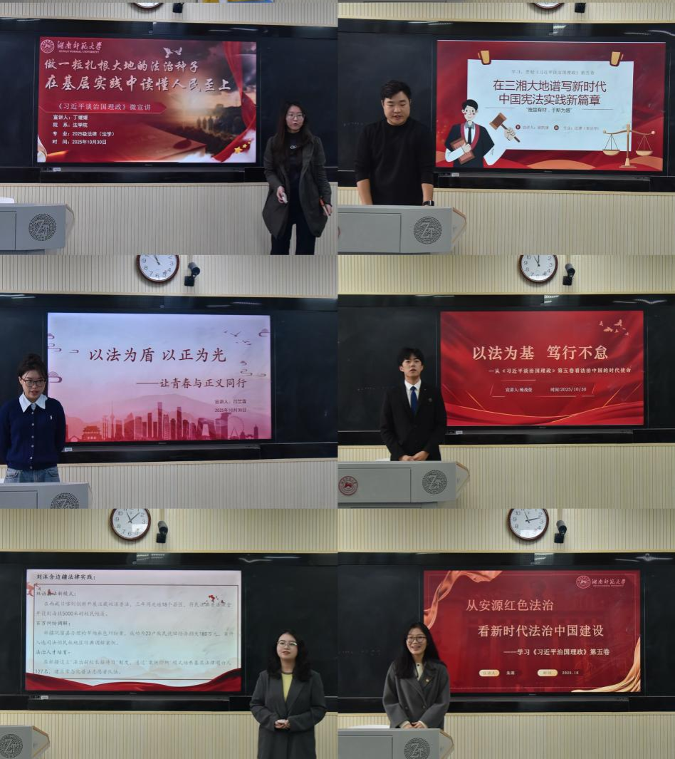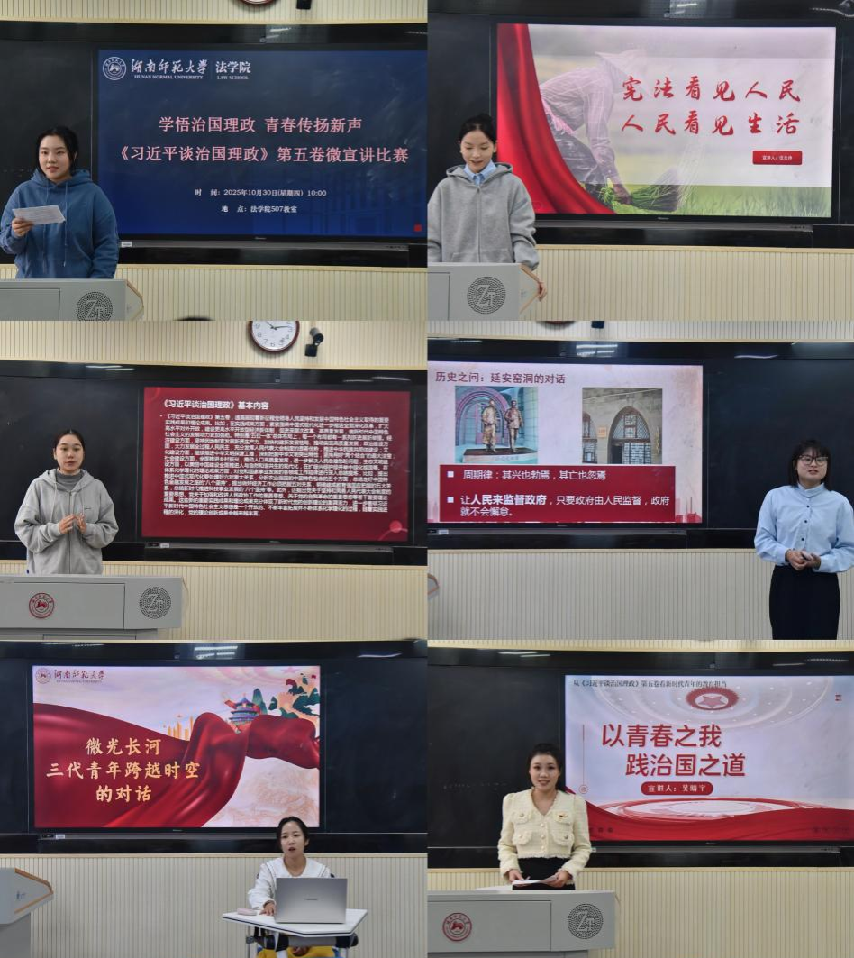 (通讯员 谢英达、谢泽宇)为深入学习贯彻《习近平谈治国理政》第五卷,推动党的创新理论深入人心。10月30日上午,我院在507教室举办《习近平谈治国理政》第五卷学生微宣讲初赛。法硕办负责人罗昊老师、姚笛博士、李西泠老师出席本次活动并担任评委。