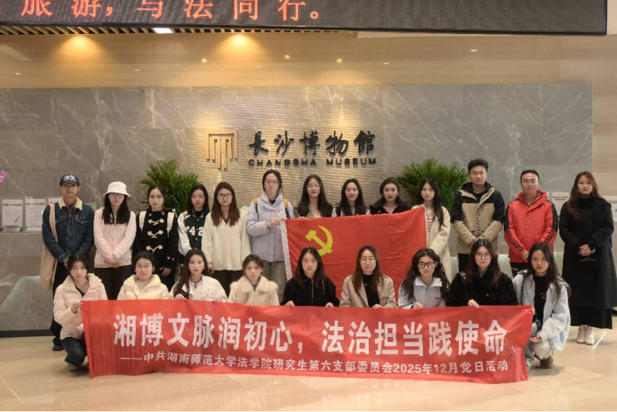 研究生第六党支部赴长沙博物馆开展“湘博文脉润初心,法治担当践使命”主题党日活动。党员们参观了长沙古代及近代历史文化陈列,从商周青铜矿冶遗迹到唐代长沙窑外销瓷,结合法学专业视角探讨古代治理智慧。活动以重温入党誓词仪式收尾,同志们表示要将湖湘文化中的治理智慧融入法治中国建设实践。