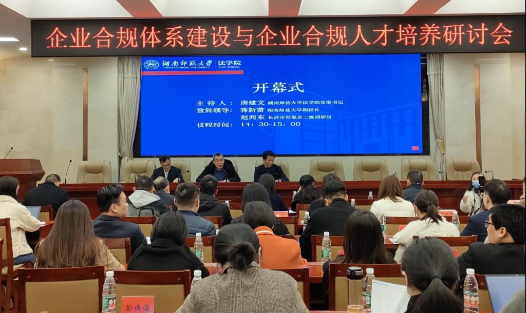 (通讯员 许志娟 王湘莹 罗雅萱)3月17日下午,企业合规体系建设与企业合规人才培养研讨会在我院205报告厅成功举行。我校副校长蒋新苗、中国国际贸易促进委员会长沙支会二级调研员赵向东、湖南省人民检察院李春阳、长沙市人民检察院李琼、岳麓区人民检察院肖彬、省国资委政策研究与法规处陈宁、国家电网湖南电力有限公司吴德松、湖南建工集团有限公司方拯、国浩律师(长沙)事务所夏祎彤、湖南金州律师事务所文颖、湖南天地人律师事务所吕帅、我院党委书记唐建文、院长肖北庚、副院长欧福永等领导和专家出席此次研讨会。